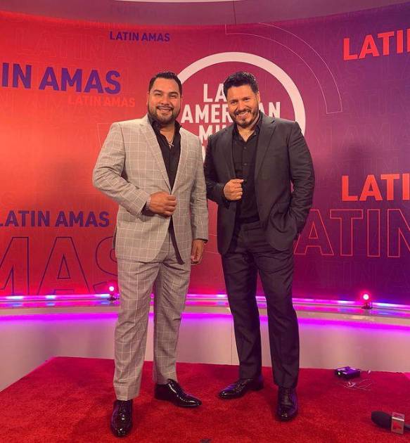 Alán Ramirez y Oswaldo Silvas, vocalistas de Banda MS, posaron en la alfombra, el primero lució un traje a cuadros en color gris, mientras que el segundo optó por el color negro.