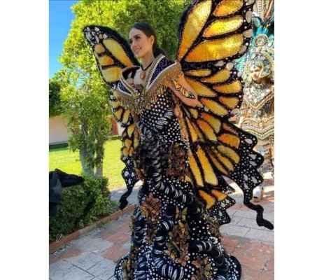 El traje está inspirado en la mariposa monarca, es color negro con detalles en oro, amarillo y naranja, y sobresalen de la espalda unas alas de este tipo de mariposas, un collar con lo que parece una crisalida de este insecto y cientos de perlas y cristales.