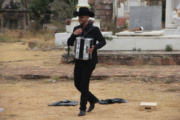 “Tu papá nos contacto, ‘güey’, a nosotros, hace... hace ratillo, desde antes de que viniéramos para acá, tu papá nos contactó, y este... que nos llamamos igual (Rodolfo), que te gusta tocar el acordeón, y te queremos entregar algo. Hijo, pásamelo carnal, por favor, pásamelo (pide a alguien más el músico)”.