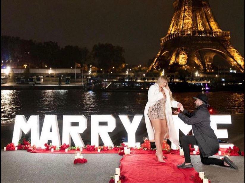 En las imágenes, se puede apreciar se encuentra a un costado del Río Sena, y de fondo la Torre Eiffel, dando el toque romántico al momento, el cual se ve adornado por las palabras Merry Me iluminadas, una alfombra roja, rosas, luciendo Mariana un vestido en color dorado, zapatillas, y un abrigo blanco, mientras que Vicente cubierto con un abrigo y sombrero, va en negro y con mocasines.