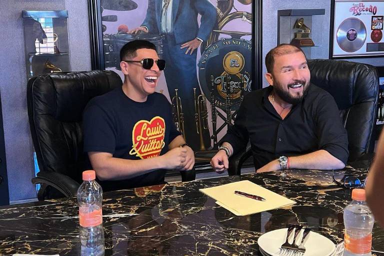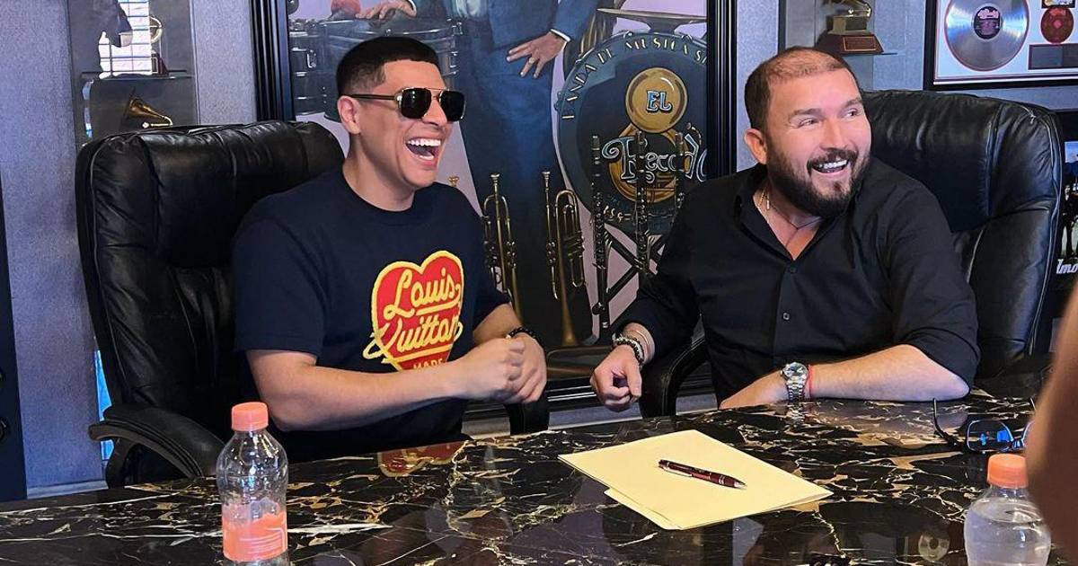 En la foto se ven los artistas sentados en las oficinas de El Recodo, en Mazatlán, y se ve sobre la mesa una carpeta y un pluma como si acabaran de firmar los acuerdos para dicho dueto. Al pie de la foto se lee “Familia un sueño más por hacerse realidad @elrecodooficial & @grupofirme. Próximamente”.