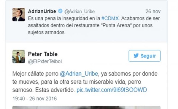 El actor Adrián Uribe denunció, a través de su cuenta de Twitter, el asalto del que fue víctima el 26 de noviembre en un restaurante. En una de las respuestas en el tuit, el usuario @ElPxterTeibol amenazó a Uribe con una “advertencia” y una fotografía de un hombre sosteniendo un arma.