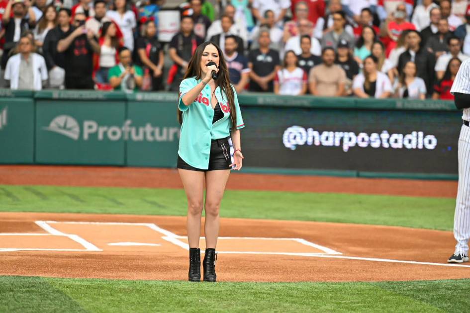 La cantante, compositora, y productora, se presentó en medio del diamante portando la casaca de los Diablos Rojos, short y botas negras, interpretando de manera magistral el Himno Nacional Mexicano.