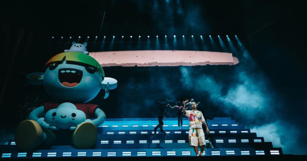 La puesta en escena del concierto trazó un decorado multicolor con formas casi sacadas de dibujos animados, entre las que se vieron muñecos gigantes, patos enormes y hasta setas de tamaños increíbles.
