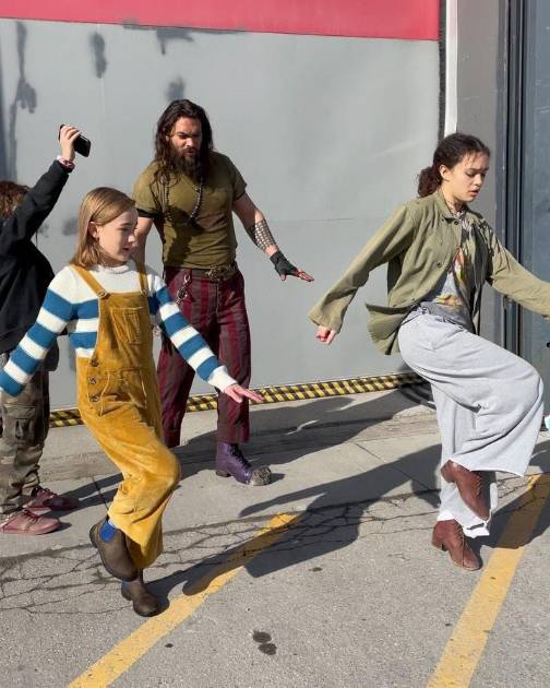El actor Jason Momoa, de 43 años, presumió sus mejores movimientos de baile en el set de la película que están filmando Slumberland en donde fue visitado por su hija, Lola laolani, de 15 años.
