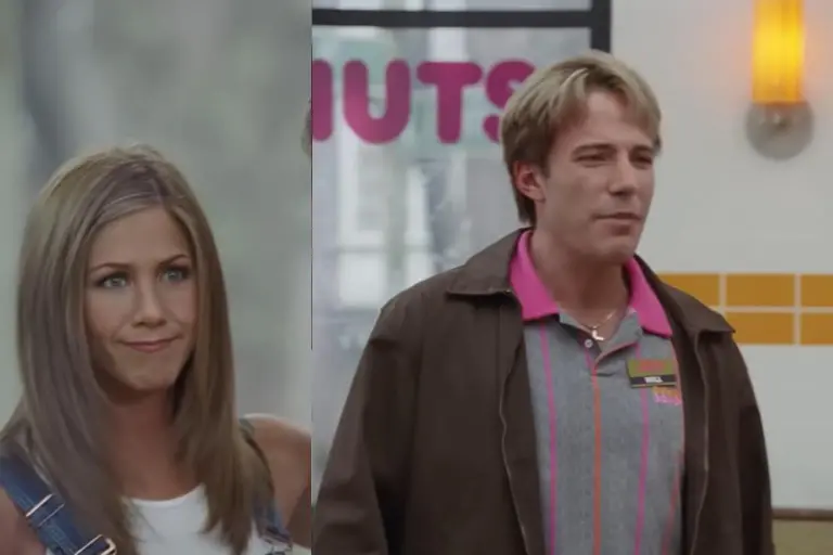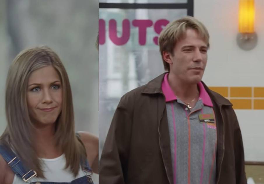 Con el corte “Rachel” y vestimenta característica de sus años en Friends, irrumpe en la escena para preguntarle a Affleck si le gustan las donas.