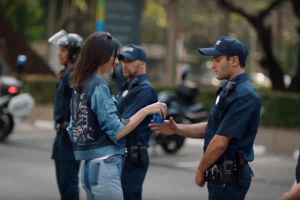 Después, la modelo se quita la peluca, se borra el lápiz labial y se integra a la protesta hasta que, eventualmente, le ofrece una Pepsi a un policía que resguarda la marcha. Este da un trago y sonríe mientras ella comienza a celebrar con sus nuevos amigos.