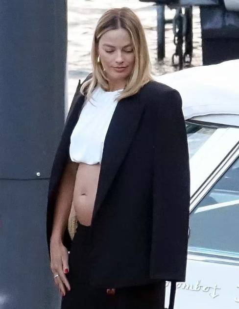 Desde allí, Margot Robbie posó con un traje sastre holgado con el que dejó al descubierto el vientre para mostrar que espera a su primer bebé.