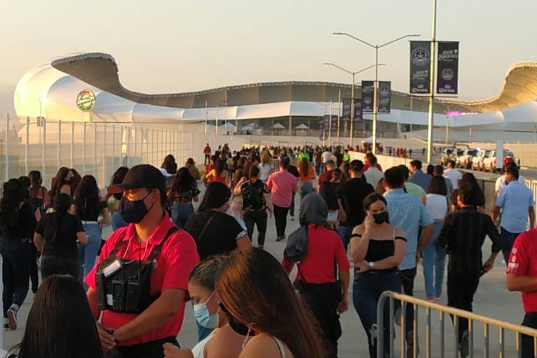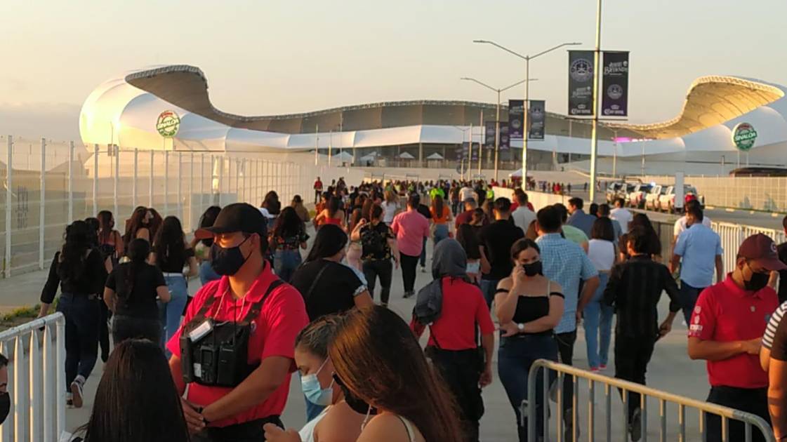 A las afueras del estadio de futbol cientos de personas esperan el acceso para la presentación del sonorense