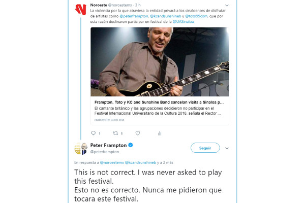 El motivo expuesto fue la violencia por la que atraviesa el estado, incluso señaló que a Frampton ya se le había hecho un adelanto de pago, pero canceló su asistencia a Culiacán.
