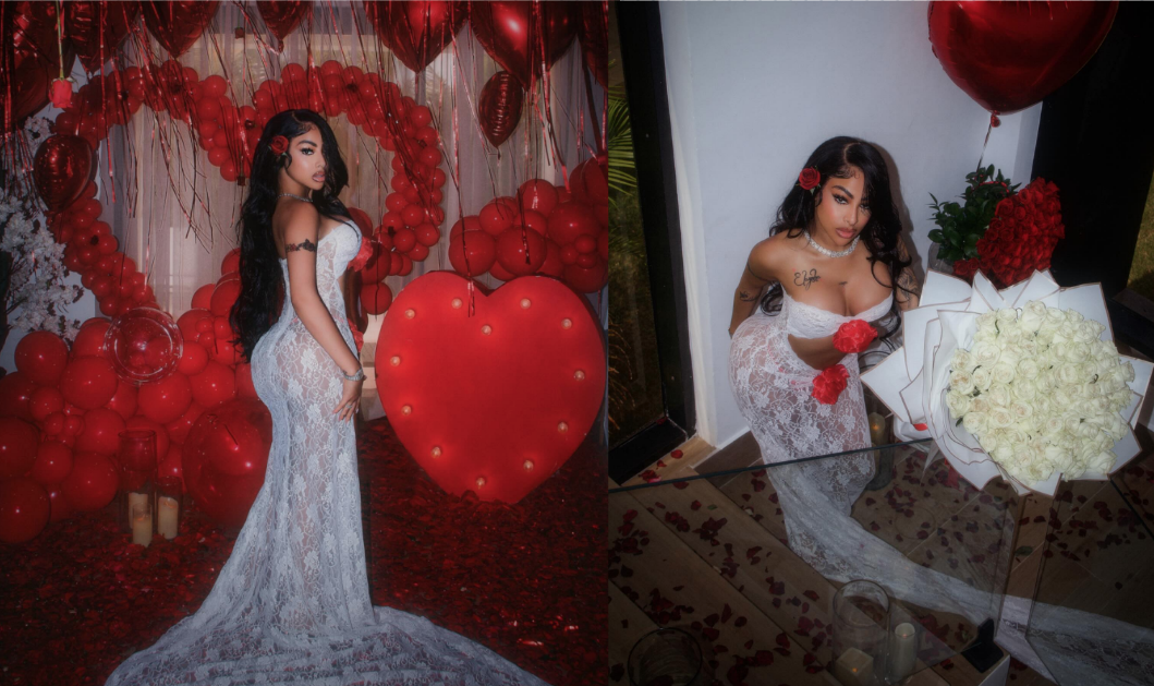La ex esposa de Anuel aparece rodeada de globos rojos en forma de corazón, con letras iluminadas detrás que dicen “te amo”. También presume dos ramos gigantes, uno de rosas blancas y otro de rosas rojas. En una de las fotos aparece su bebé Cattleya, también vestida de blanco.