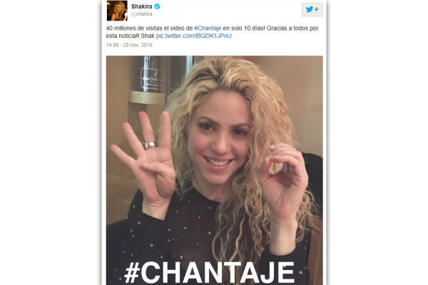 Shakira colgó la foto el 28 de noviembre, pero el 4-0 era en realidad un 40, un gesto con el que celebraba los 40 millones de reproducciones de su video Chantaje.