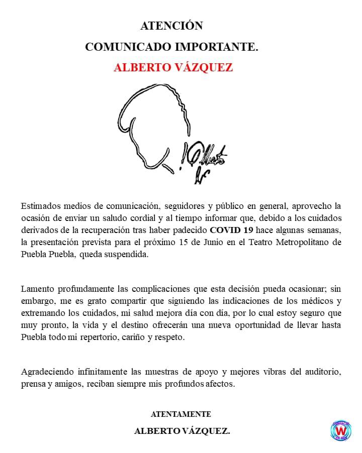 En torno al concierto que ya tenía pactado, Alberto Vázquez expresó: “Mis compañeros Angélica María, César Costa y Enrique Guzmán estarán con ustedes en el Teatro Metropolitano de Puebla, Puebla, donde podrán disfrutar de una noche muy especial y llena de hermosas canciones” .