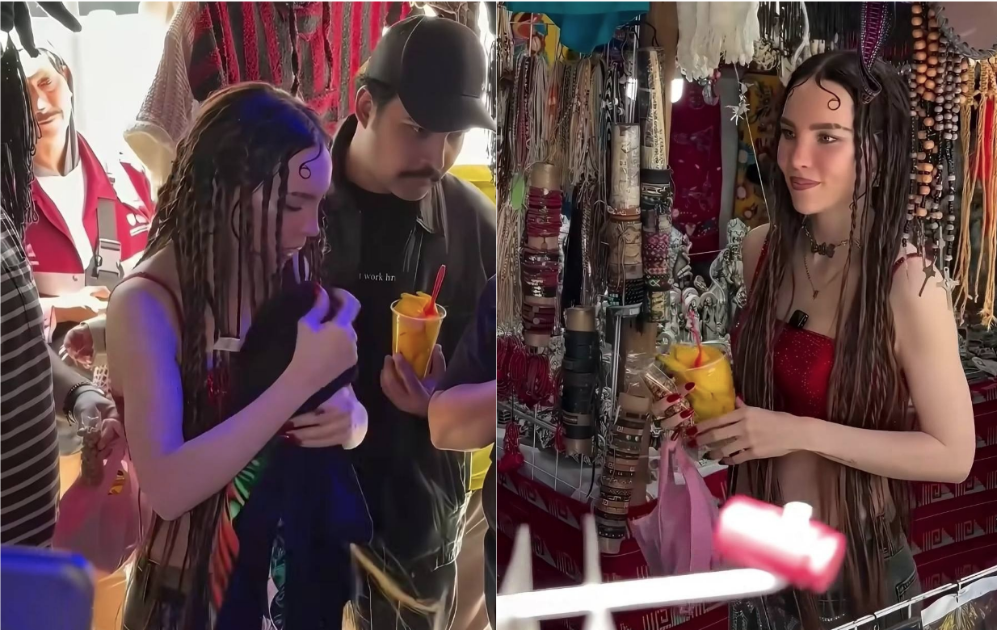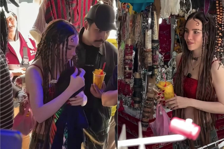 Vestida con un top rojo, Belinda se mezcló entre los asistentes del tianguis, generando sorpresa por la naturalidad con la que disfrutaba un refrigerio habitual en la ciudad, señala infobae.com