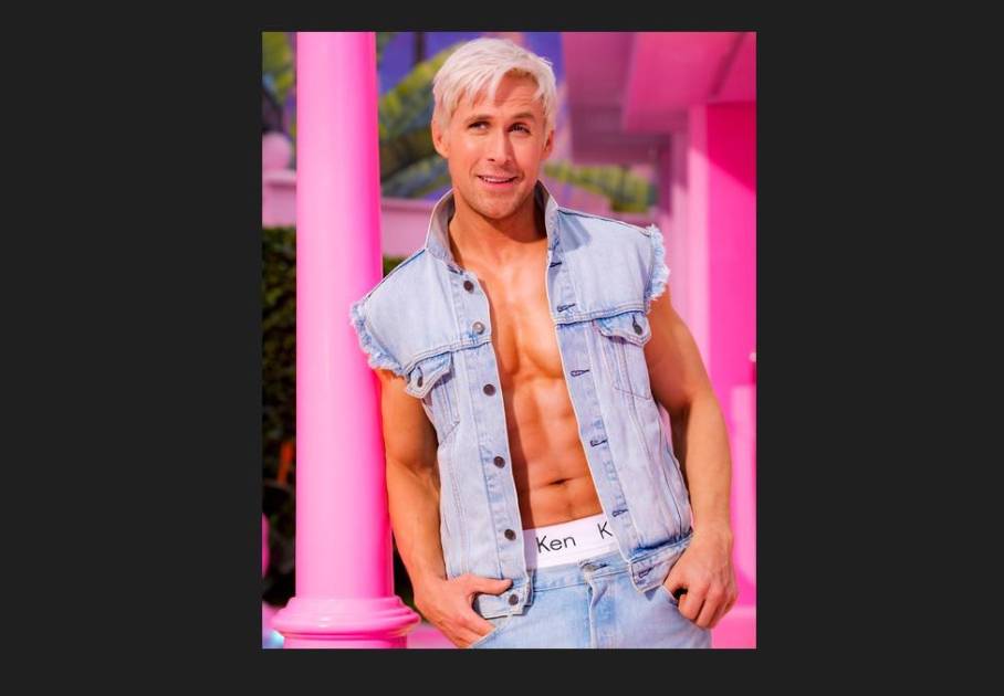 Con el cabello rubio, pantalón y chaleco de mezclilla desabrochado mostrando un dorso marcado, se ve a Ryan Gosling caracterizado como Ken, en la película live action de Barbie.
