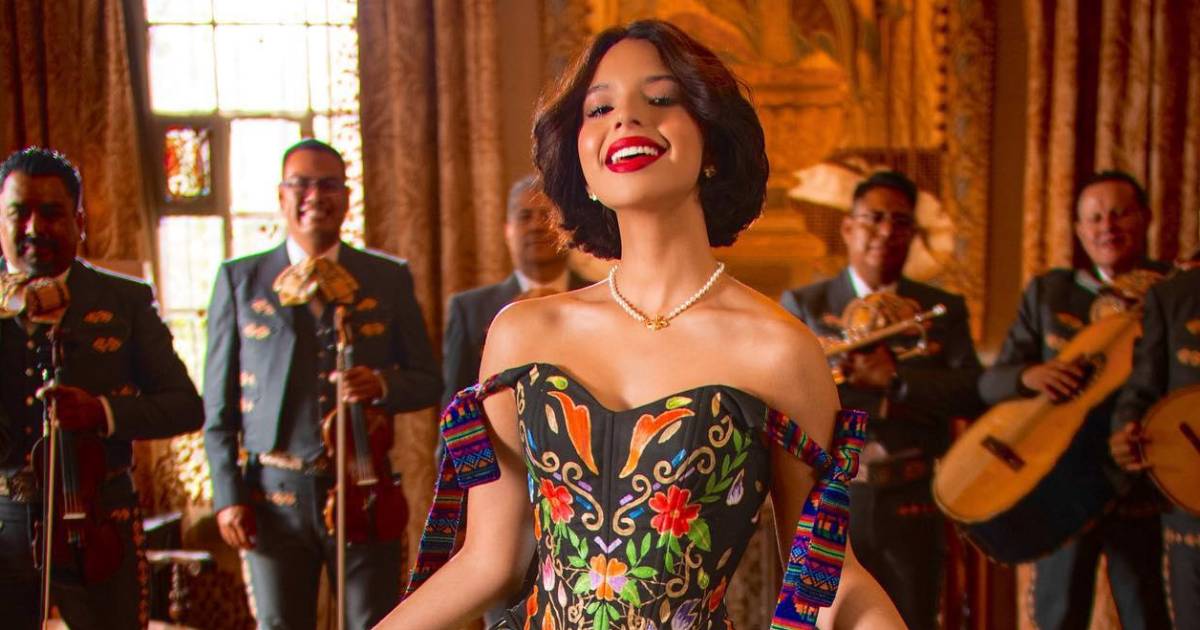 La cantante porta un vestido negro, bordado en colores mexicanos y la acompaña en el tema un mariachi.
