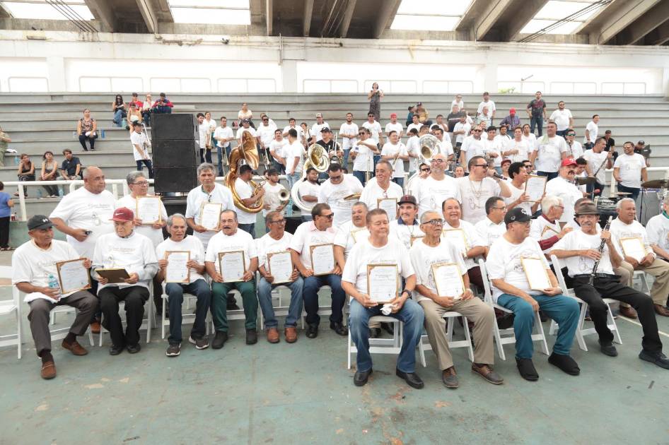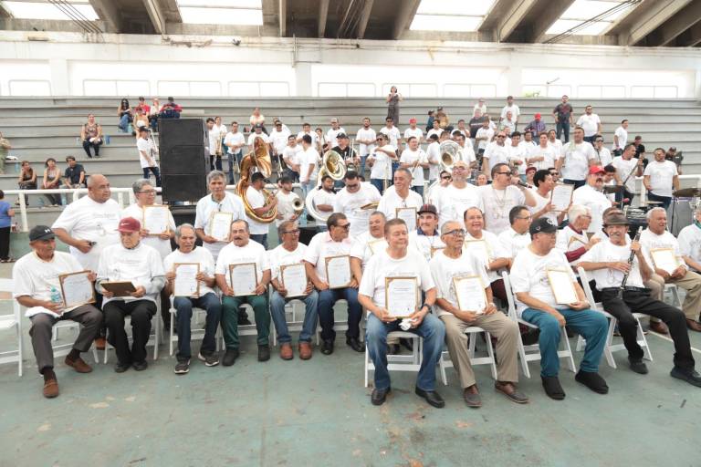 Fueron un total de 35 los homenajeados, quienes a lo largo de esta ceremonia desfilaron para recibir su reconocimiento, al compás de las piezas musicales que más evocan su paso como músicos, interpretadas por Banda la Mazatleca, que amenizó el evento.