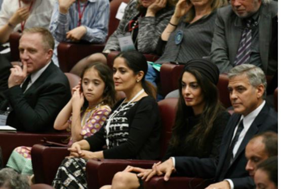 MÉXICO (AP)._ La actriz mexicana Salma Hayek y los actores Richard Gere y George Clooney acudieron a la reunión de Scholas Ocurrentes (Escuelas para el encuentro) que se realizó en el Aula del Sínodo del Vaticano a la que también acudió el Papa Francisco.