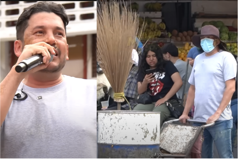 De pronto, el cantante comienza a recorrer los pasillos del mercado siendo grabado en todo momento, interactuando con los visitantes, hasta llegar a la plaza, donde con escoba en mano, comienza a barrer, esperando las instrucciones.