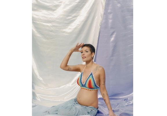 En las publicaciones, Halsey luce una cabellera muy corta, y en dos de ellas posa topless presumiendo su avanzado embarazo.