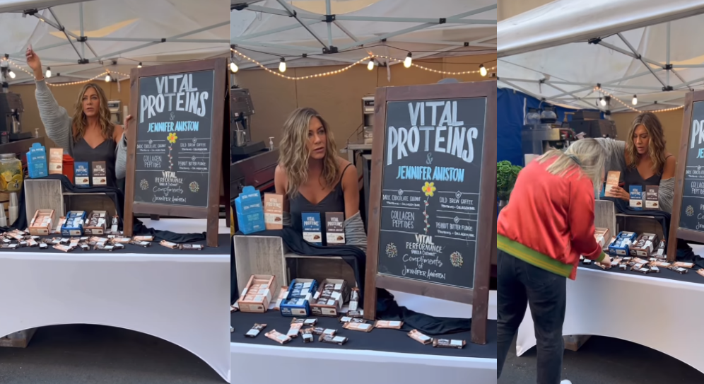 En un video publicado por la misma Aniston, se la puede observar detrás de una mesa llena de sus barras nutricionales, promocionando los sabores de las mismas, e invitando al público a que se acerque a su pequeño puesto, decorado con una pizarra que anunciaba el nombre de la marca.