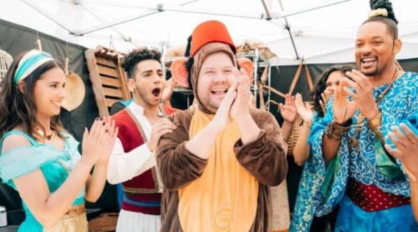 En compañía de James Corden, quien se caracterizó primero como el genio de la lámpara y después como Abu, el elenco en cada alto de una concurrida avenida, cantó y bailó algunas canciones del clásico de Disney.