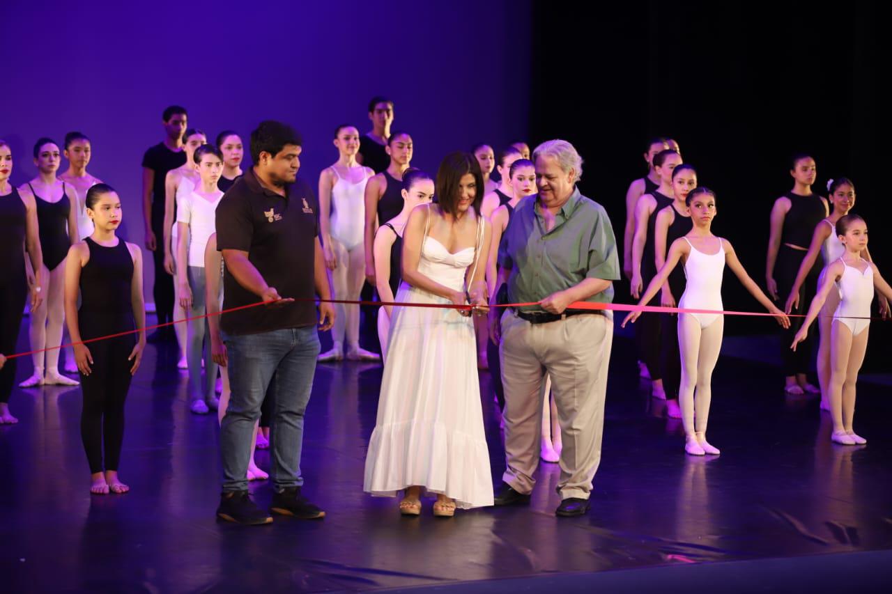 Georgina Higuera, acompañada por Raúl Rico y Mario Chávez, así como bailarines, cortaron el listón inaugural. ( ) -