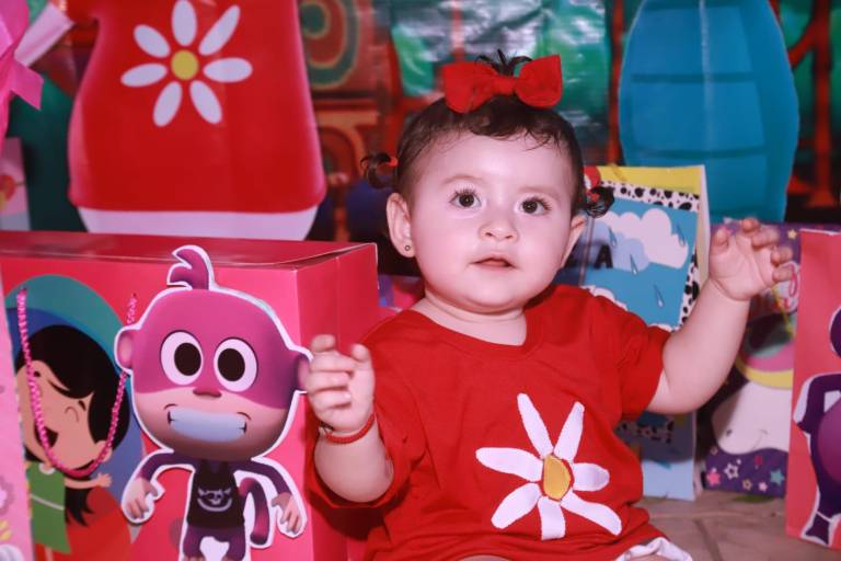 La pequeña disfruta el festejo de su personaje favorito en su primer cumpleaños