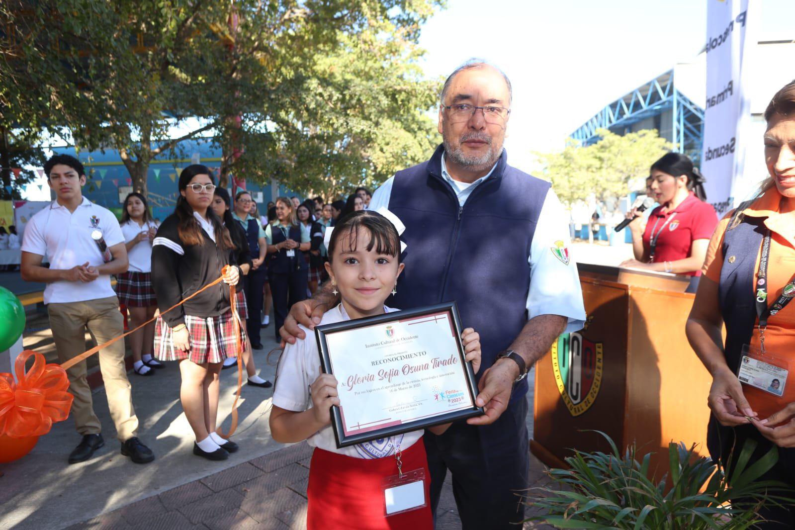 La pequeña Gloria Sofía Osuna Tirado recibió un reconocimiento de manos del Padre Gabriel Zavala Soria, director del ICO. ( ) -