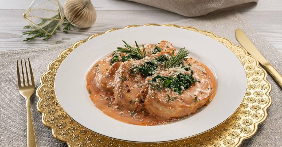 Para finalizar sirve con salsa cremosa, espinacas y queso parmesano.