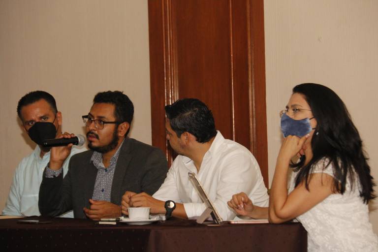 Juan Manuel Aguilar Antonio, investigador de Casede; Adrián López Ortiz y Guillermina García Nevares, director general y directora editorial de Noroeste, respectivamente; y Juan Manuel Espinoza Verdugo, director de la Coordinación General del Consejo Estatal de Seguridad Pública, participaron durante la charla.