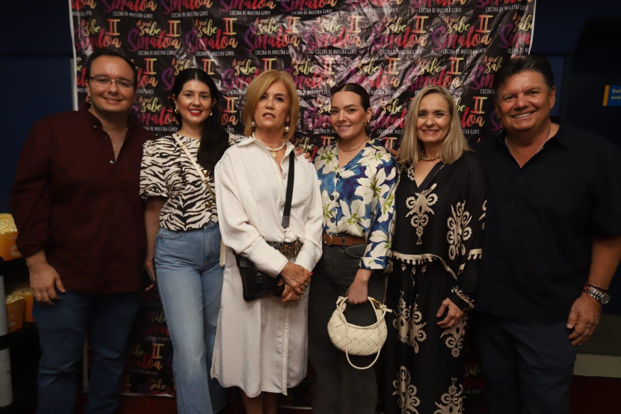 Isaac Aranguré, los chefs Carolina Zataráin y Jorge Zorrilla se toman la fotografía del recuerdo con el equipo de producción en lo que fue la premier de A qué sabe Sinaloa. ( ) -