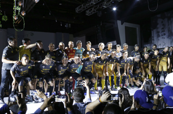 Gaspar Servio encabezó la presentación con el uniforme de portero, con estampados en triángulos en tonos azul y tinto, para después dar paso a Vinicio Angulo, Jesús Escoboza y Julio Naca, algunos de los jugadores que lucieron el jersey de visitante en color negro, con vivos dorados y degradado claro a la altura del pecho.