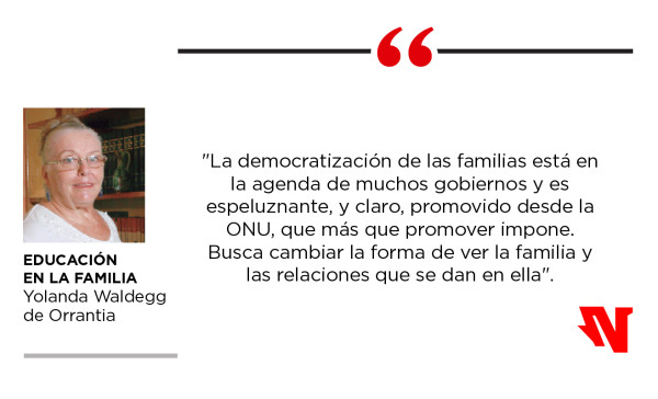 Siguiendo con el tema de la familia, no sé si están enterados, pero el tema de la democratización de las familias está en la agenda de muchos gobiernos y es espeluznante, y claro, promovido desde la ONU, que más que promover impone. Busca cambiar la forma de ver la familia y las relaciones que se dan en ella.
