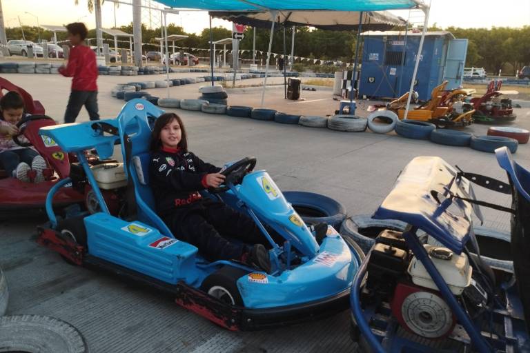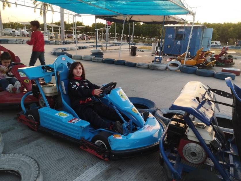 Poco después se trasladaran a los go karts, ahí cada uno de sus amiguitos dieron varias vueltas en los carros para culminar la actividades en una sala de cine, en donde disfrutaron de una película y un paquete cumpleañero compuesto de hot dogs, refrescos, palomitas y dulces.