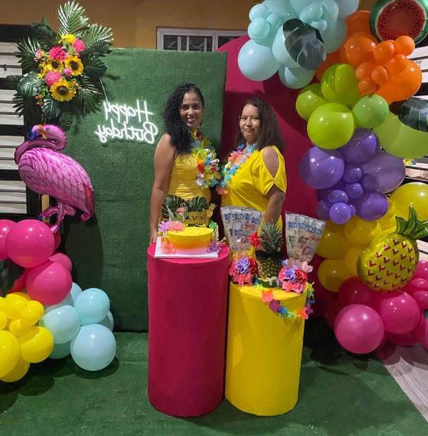 El festejo estuvo lleno de buenos deseos para las cumpleañeras y tuvo lugar en el hogar de Linda Pérez, donde las cumpleañeras lucieron vestidos en color amarillo, collares de flores, acorde a la decoración con elementos tropicales.