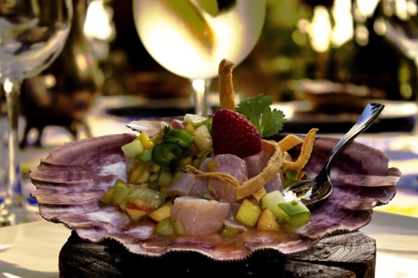 Y allí estaba, con un encanto divino a la vista, un ceviche frutal servido en conchas de almeja garra de león, coronado con una ramita de cilantro, una aterciopelada frambuesa roja y rizos fritos de tortilla de maíz, colocados con delicadeza gourmet por el joven Octavio Ochoa Blancarte, alumno del Diplomado en Gastronomía Internacional, en el Instituto de Ciencias y Artes Gastronómicas.