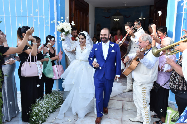 Petálos de rosas blancas fueron lanzados a los novios al salir del recinto religioso, donde los esperaba un mariachi para celebrar su unión.