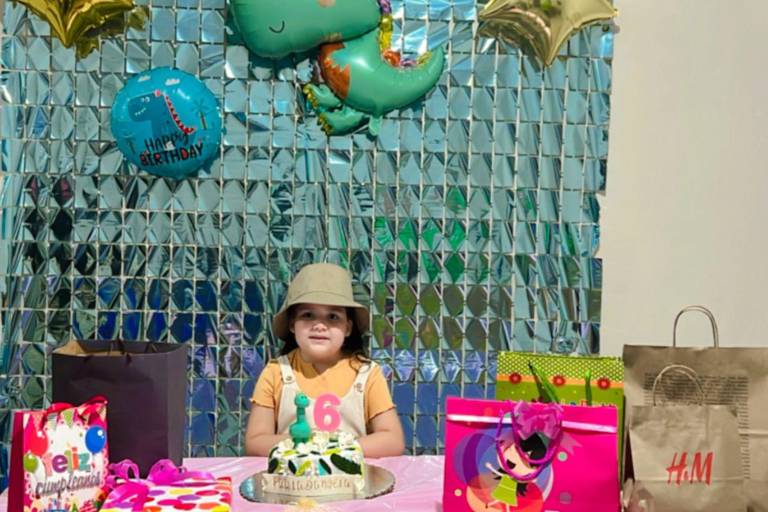 La fiesta estuvo decorada con la temática de dinosaurios y vistió atuendo de Dora la Exploradora y se sirvieron pizzas, pastel, dulces y bocadillos, todo en casa de los papás de la festejada.