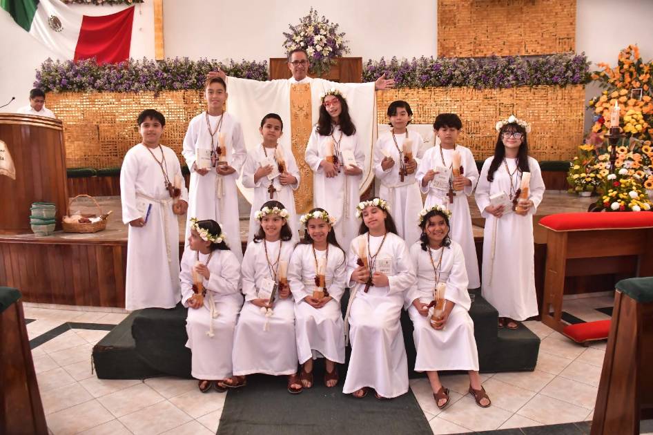 La ceremonia fue oficiada por el Padre Xaveriano Ramón Cerratos Ríos, en el Templo de San Judas Tadeo, en la que los niños portaron una túnica con una cruz al frente, que los hizo lucir como pastorcitos.