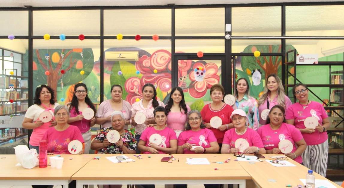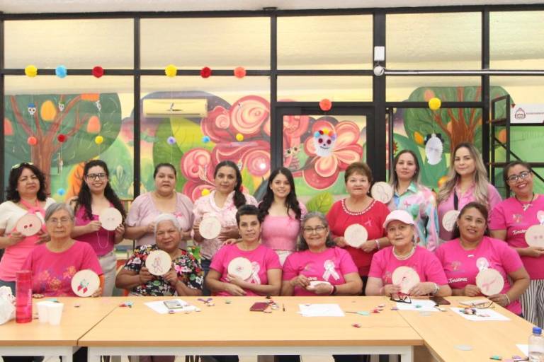 Vestidas de rosa y con plena conciencia del autocuidado, mujeres culiacanenses participaron en el taller de bordado Entre páginas y puntadas que este mes tuvo el tema “Octubre, mes de la prevención del cáncer de mama”.