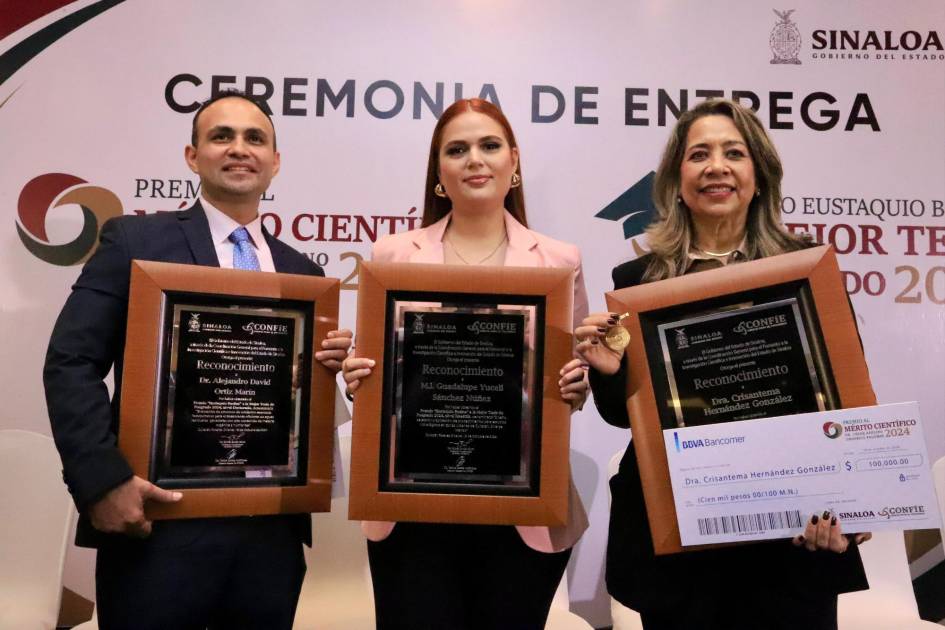 Con el objetivo de reconocer las contribuciones y el sobresaliente desempeño en el área de ciencia y tecnología en materia de desarrollo científico, tecnológico e innovación de la comunidad científica sinaloense, se entregó el Premio al Mérito Científico 2024 “Dr. Cesar Abelino Ordorica Falomir” a la doctora Crisantema Hernández González y el Premio “Eustaquio Buelna” a la Mejor Tesis de Posgrado a Alejandro David Ortiz Marín en nivel doctorado y a Guadalupe Yuceli Sánchez Núñez en nivel Maestría.