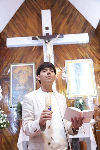 Cargando sobre sus manos los símbolos católicos, la biblia, el rosario y la vela entró René Tirado Valdez a la Parroquia La Sagrada Familia para recibir por primera vez la hostia consagrada.