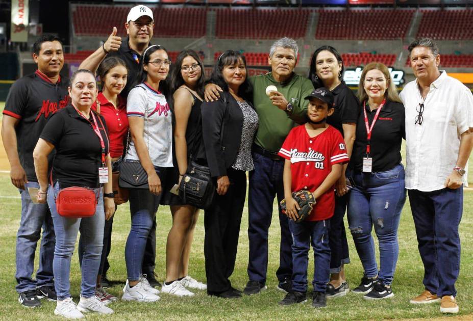 Ante la afición y en compañía de su familia, así como también de Elizabeth Peraza, Guillermina García y Elva Aguirre, directoras ejecutiva y editorial, y subdirectora administrativa, respectivamente, de Noroeste, el homenajeado lanzó la bola al General de Brigada, Guillermo Almazán.