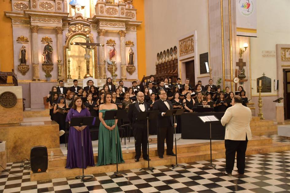 Bajo la dirección artística del maestro Marco Antonio Rodríguez, los más de 50 integrantes, ‘inundaron’ con sus voces educadas el atrio de La Catedral, regalando con ello una interpretación única de los 10 movimientos que tiene la pieza, contando con la participación especial de los solistas, el barítono Gabriel Rodríguez, la soprano Abigail Favela, la mezzo-soprano Estefanía Cano, y el tenor Iván Valdez, acompañados por el pianista Salomón Gil.