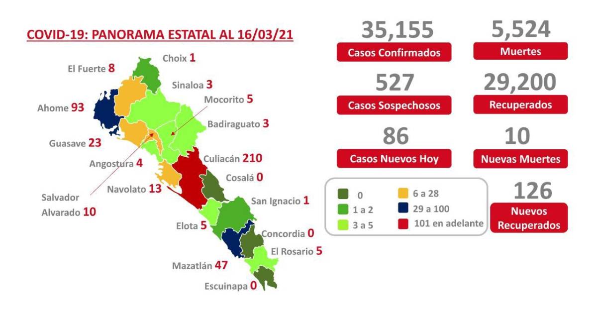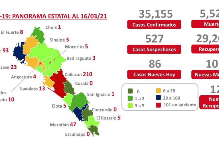 Este 16 de marzo fueron confirmados 86 nuevos infectados, 57 son originarios de Culiacán, 10 de Ahome, nueve de Salvador Alvarado, cinco de Mazatlán y cinco de Guasave. En total han sido detectados en el estado 35 mil 155 contagios desde el 28 de febrero del 2020.