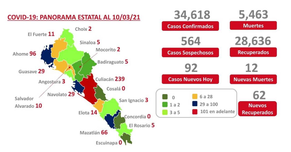 Este miércoles las autoridades de salud confirmaron 92 nuevos infectados, 47 en Culiacán, 19 en Ahome, siete en Mazatlán, siete en Guasave, Navolato, Badiraguato, Sinaloa, Rosario y Elota sumaron dos cada uno. Desde el 28 de febrero del 2020 al 10 de marzo del 2021 han detectado 34 mil 618 contagios en la entidad.