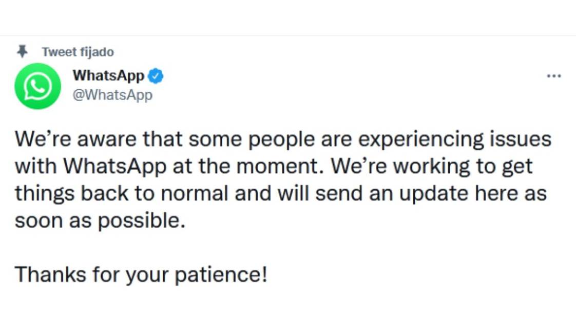 ”Somos conscientes de que algunas personas están experimentando problemas con WhatsApp en este momento”, expuso en la red social Twitter.