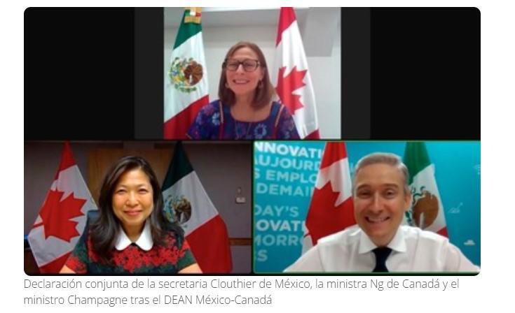 MÉXICO._ La secretaria de Economía de México, Tatiana Clouthier, junto con la ministra de Comercio Internacional, Promoción de Exportaciones, Pequeñas Empresas y Desarrollo Económico de Canadá, Mary Ng, y el ministro de Innovación, Ciencia e Industria de Canadá, François-Philippe Champagne, anunciaron el lanzamiento del Diálogo Económico de Alto Nivel México-Canadá (DEAN Mex-Can).