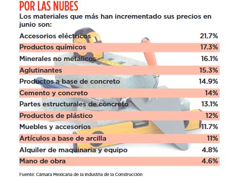 Los materiales que más han incrementado sus precios en junio son: accesorios eléctricos, con 21.7 por ciento respecto a junio de 2016; productos químicos, 17.3 por ciento; minerales no metálicos, 16.1 por ciento; aglutinantes, 15.3 por ciento; productos a base de concreto, 14.9 por ciento; cemento y concreto, 14 por ciento; partes estructurales de concreto, 13.1 por ciento; productos de plástico, 12 por ciento; muebles y accesorios, 11.7 por ciento, y artículos a base de arcilla, 11 por ciento.